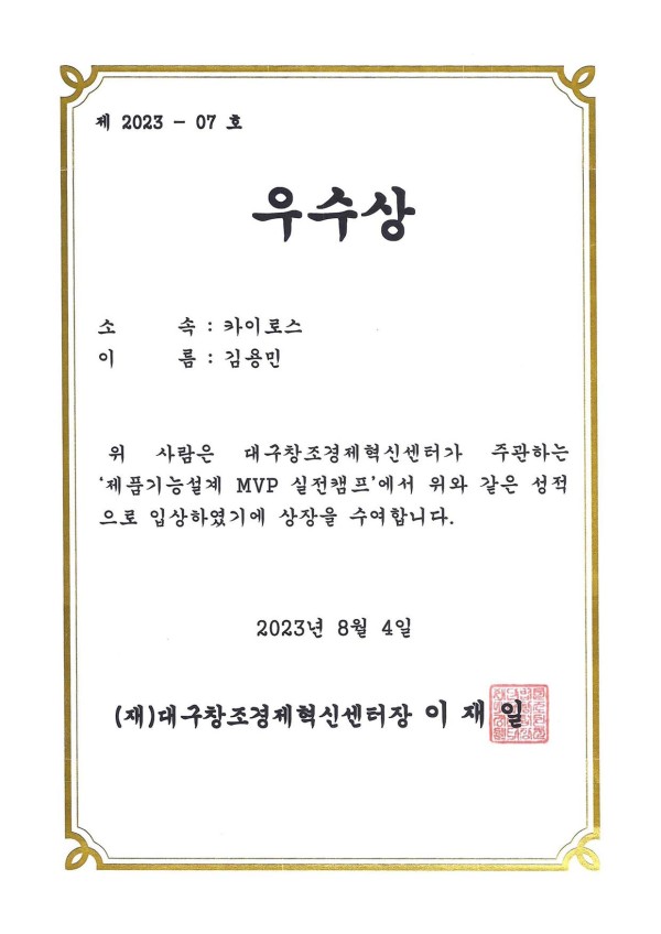 페이지 정보 작성자 최고관리자 댓글 0건 조회 109회 작성일 24-01-02 15:53 목록 제품기능설계 MVP 실전캠프 우수상 본문 제품기능설계 MVP 실전캠프 우수상 이전글특허 제10-2197856호 24.01.02 다음글의료기기판매업신고증 24.01.02 댓글 0 댓글목록 등록된 댓글이 없습니다.
